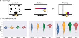 En este trabajo mostramos que pacientes con accidente cerebrovascular fronto-insular (ACV), con demencia de Alzheimer (DA) o frontotemporal (DFT) presentan déficits en la capacidad de auto-monitoreo evaluada con una tarea experimental explícita (confianza, afectada en AD) e implícita (riesgo, afectada en ACV, AD y FTD). El daño en áreas ventromediales se asoció a los déficits de confianza mientras que el daño fronto-temporo-insular se asocio a la conducta de riesgo. Los resultados son relevante para una la compresión de los déficits de auto-monitoreo asociados a pérdida de insight, autoconciencia y metacognición en estos pacientes.
