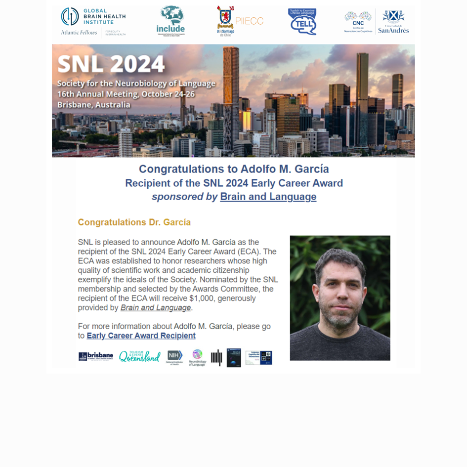 El Dr. Adolfo García recibió el premio Early Career Award de la Society for the Neurobiology of Language.