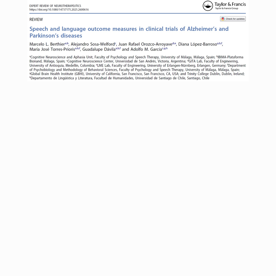 Berthier, M. L., Sosa-Welford, A., Orozco-Arroyave, J. R., López-Barroso, D., Torres-Prioris, M. J., Dávila, G. & García, A. M. (2025). Speech and language outcome measures in clinical trials of Alzheimer’s and Parkinson’s diseases. Expert Review of Neurotherapeutics 26(1), 15-34.